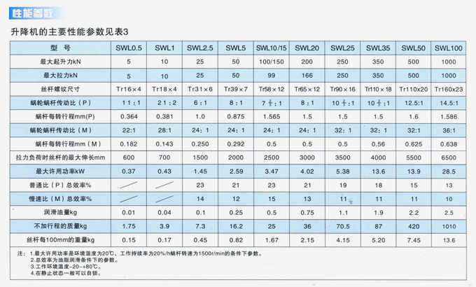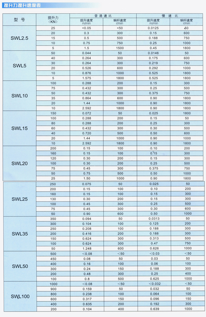 SWL蝸輪絲桿升降機(jī)主要性能參數(shù)表、提升力和提升速度表