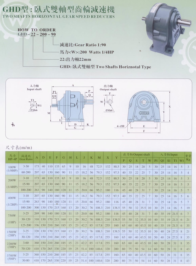 GHD臥式齒輪減速電機(jī)的型號(hào)表示方式,GHD臥式小齒輪減速機(jī)馬達(dá)的外形尺寸表,GHD18,GHD22,GHD28,GHD32,GHD40,GHD50;75W(1/10HP),100W(1/8HP),200W(1/4HP),400W(1/2HP),750W(1HP),1500W(2HP),2200W(3HP),3700W(5HP)
